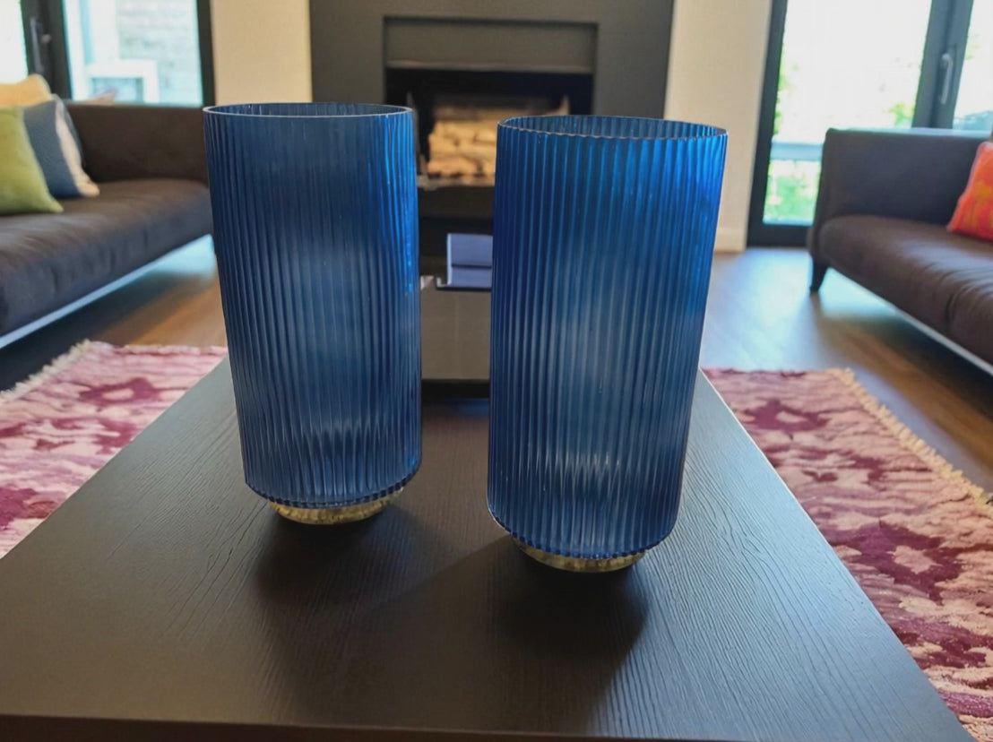 This elegant pair of Smoky Blue Fluted Glass Vases or Candle Holders captures the calm and depth of twilight skies. Their tall, cylindrical forms are adorned with delicate vertical ridges that catch and bend the light like ripples on a still lake. The rich, moody blue hue adds a sense of quiet luxury, while the golden-toned base lends just the right touch of warmth and refinement. Whether cradling soft candlelight or standing gracefully on their own, these pieces bring a serene sophistication to any space—like a whisper of evening wrapped in glass. Perfect as vases or candle holders, they’re timeless accents for peaceful, glowing moments.