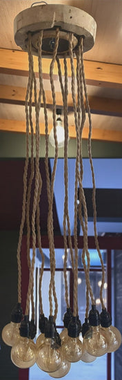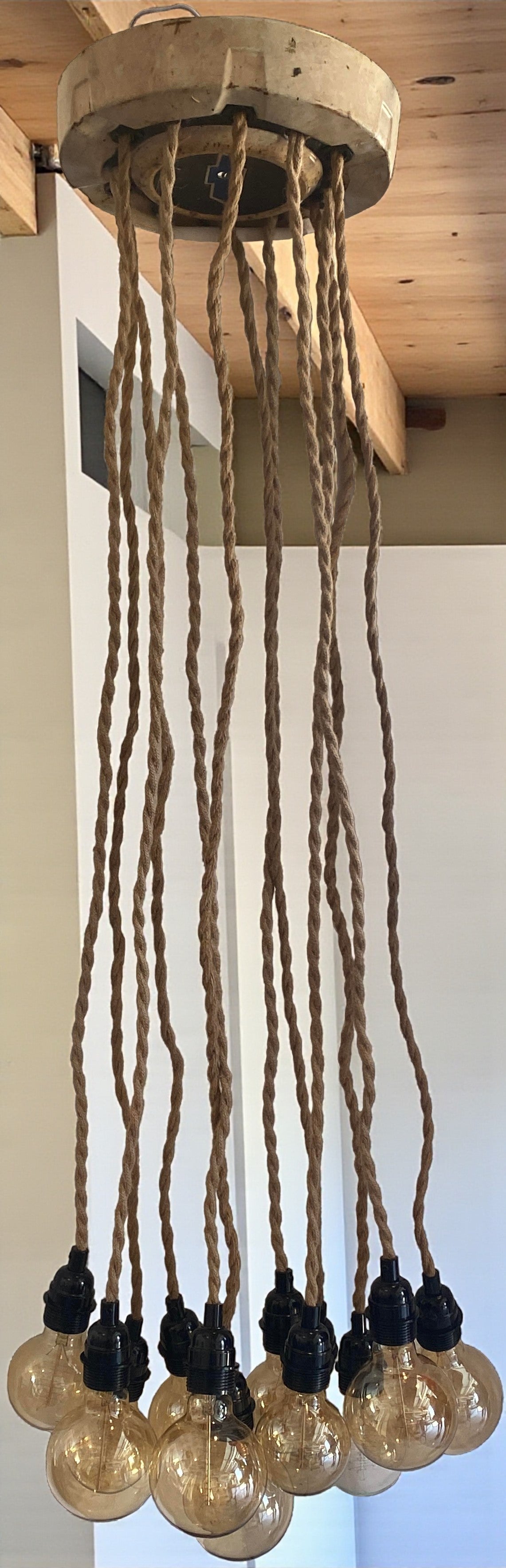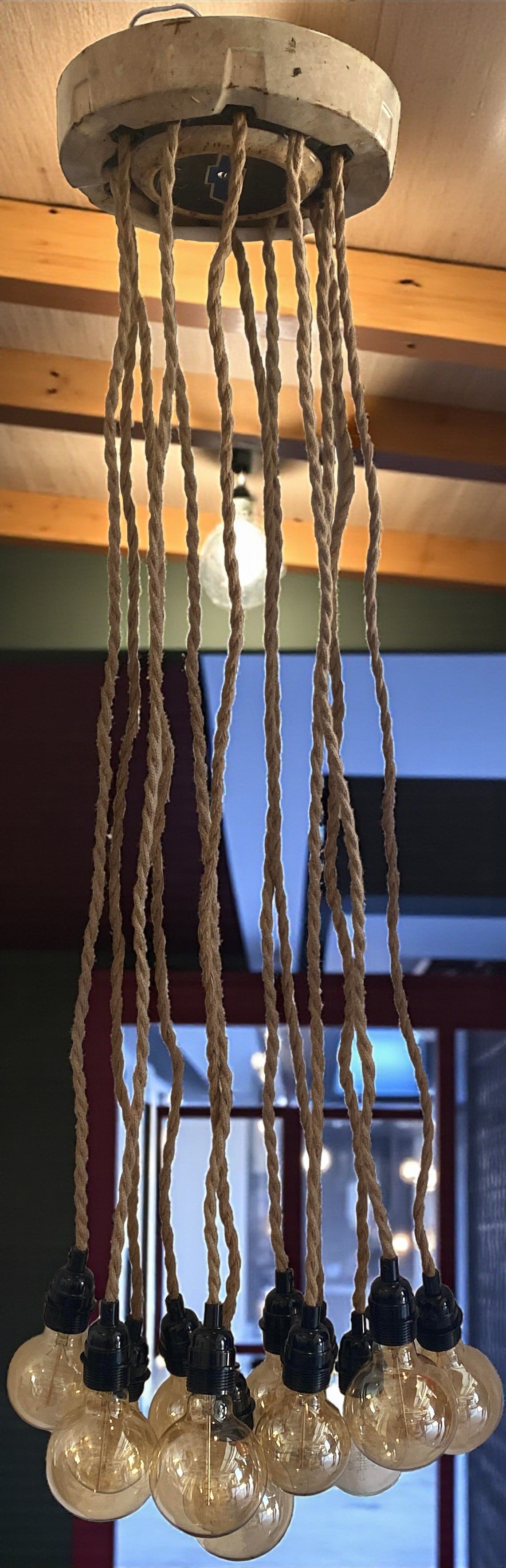 Twelve rope cords extend gracefully from the hubcap, each holding an exposed Edison bulb that glows with warm, ambient light. The combination of weathered metal, natural rope, and classic filament bulbs creates an unforgettable blend of industrial charm and artistic vision.